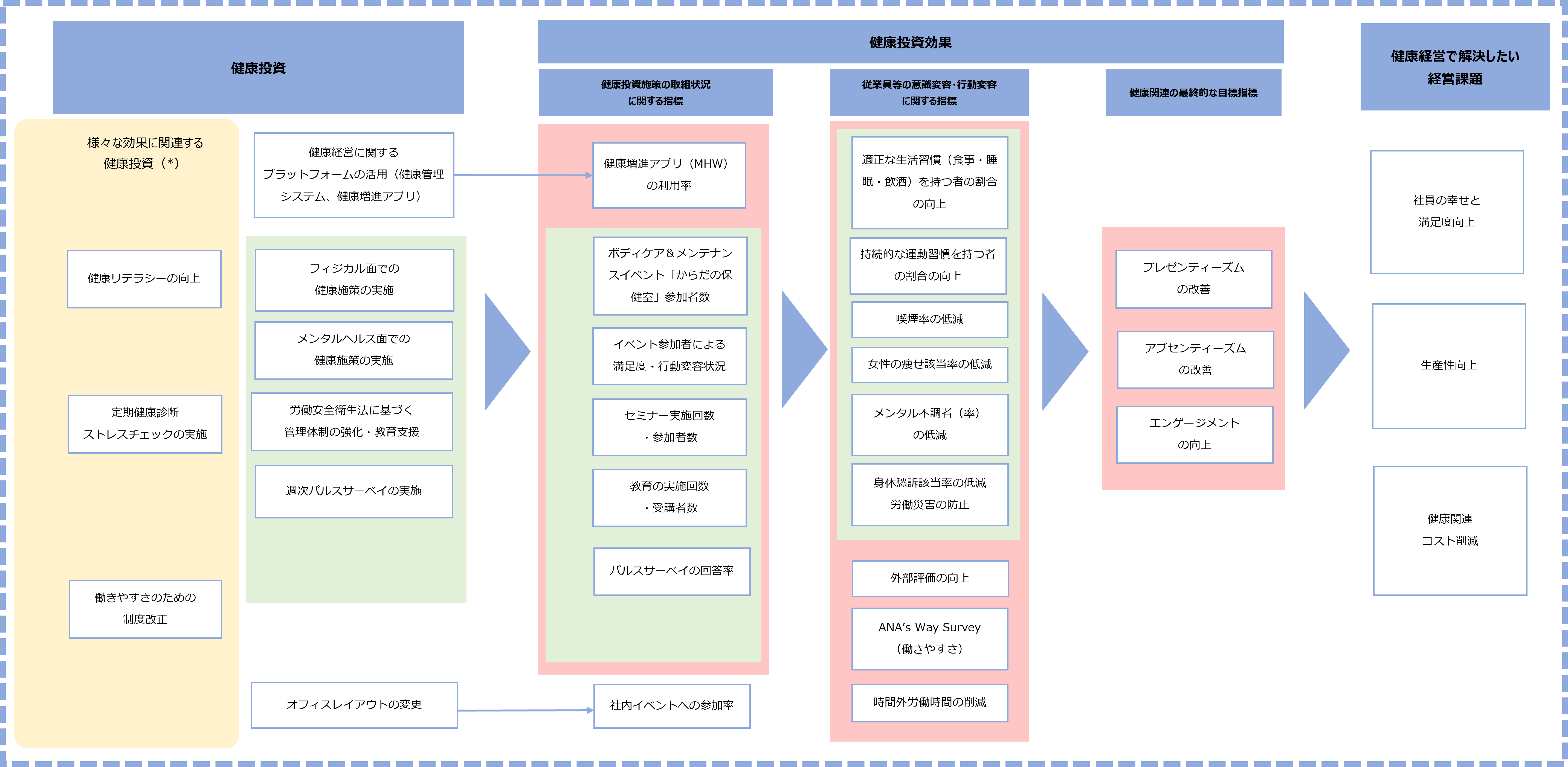 全日空商事グループでは、「ANAグループ 健康経営宣言」のもと、全ての社員一人ひとりとその家族が、心身共に健康であることが重要と考えています。