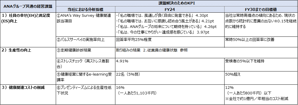 「ANAグループ健康経営」の推進に向けて、課題から指標を設定し、その指標向上に向けて、PDCAサイクルを循環させています。また取り組みの経営に対する影響の分析を行うべく、健康関連コストとして、アブセンティーズム*1、プレゼンティーズム*2のデータを分析しています。