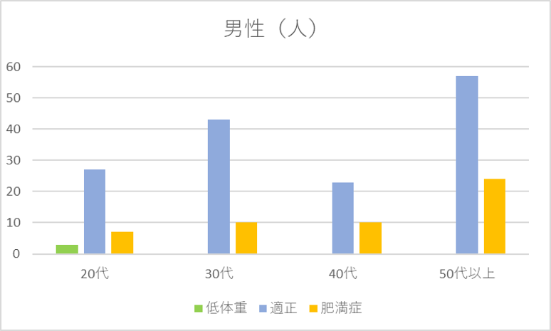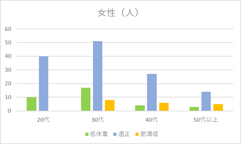 - BMI適正者比率:18.5≦BMI*<25の人の割合