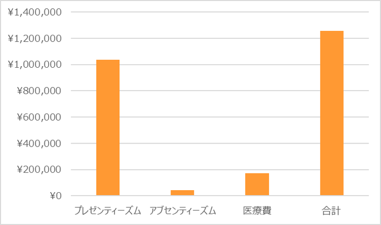 - アブセンティーズム=[アブセンティーズム(日数)]×[各年度の一人当たり日収(年収を365日で割った額)]